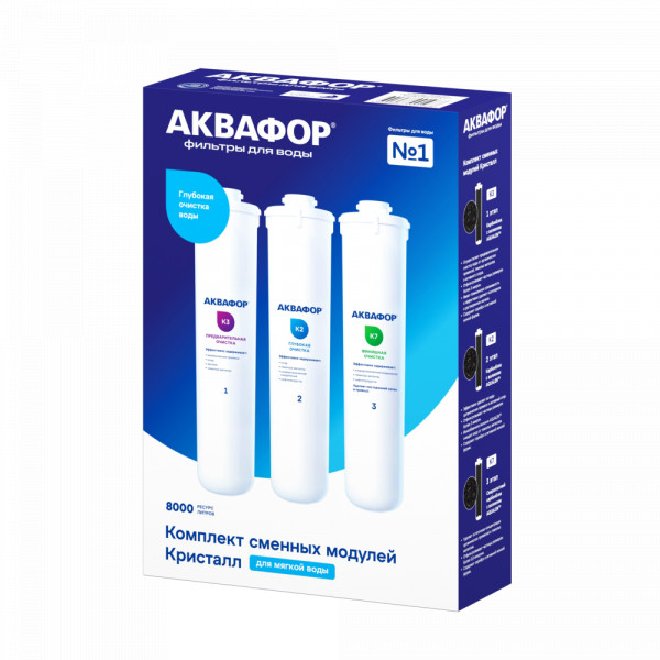 • Комплект сменных модулей глубокой очистки. Оптимален для мягкой воды. В условиях жесткой воды он полностью выполняет функцию глубокой очистки от вредных примесей, однако не снижает минерализацию. Поэтому, если при кипячении на нагревательных элементах образуется белый налет, рекомендуем рассмотреть специализированный комплект с умягчающим модулем для глубокой очистки воды.